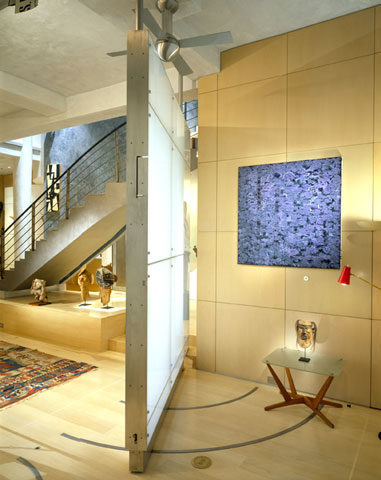 Moveable room divider and door, glass and aluminum, custom pivots.